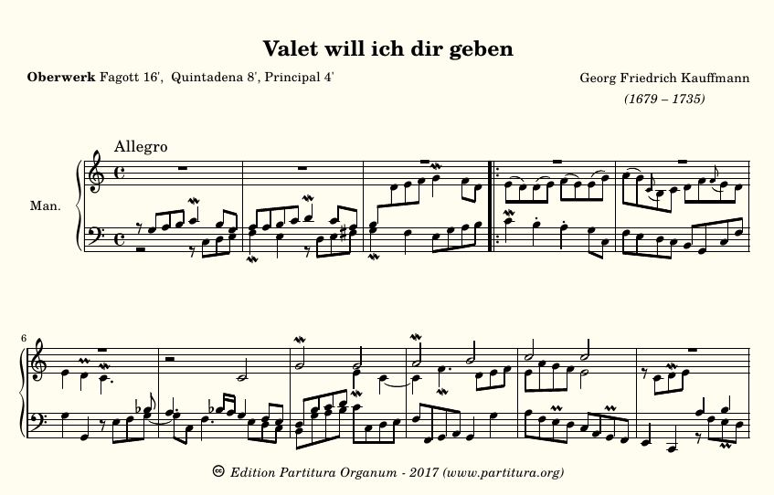 Kauffmann’s first prelude on “Valet will ich dir geben” calls for a combination that I by now consider as ‘typically Kauffmann’: Fagott 16′, Quintadena 8′ and Principal 4′. It’s not the exact combination that is typical, but the combination of flavors: a reed, a quintadena, a 16-feet register and a 8-feet. I’m stil not sure the 16-feet means that the piece is to be played an octave up or as notated. By means of experiment this time I play it as written ánd with the 16-feet Fagot. That result is actually quite intruiging.
